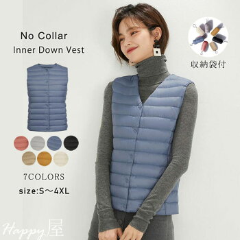 インナーダウンベストノーカラー レディース トップス シンプル アウター ショート丈 ダウンベスト 襟なし ラウンドネック Vネック 収納袋付 軽量 秋冬 送料無料