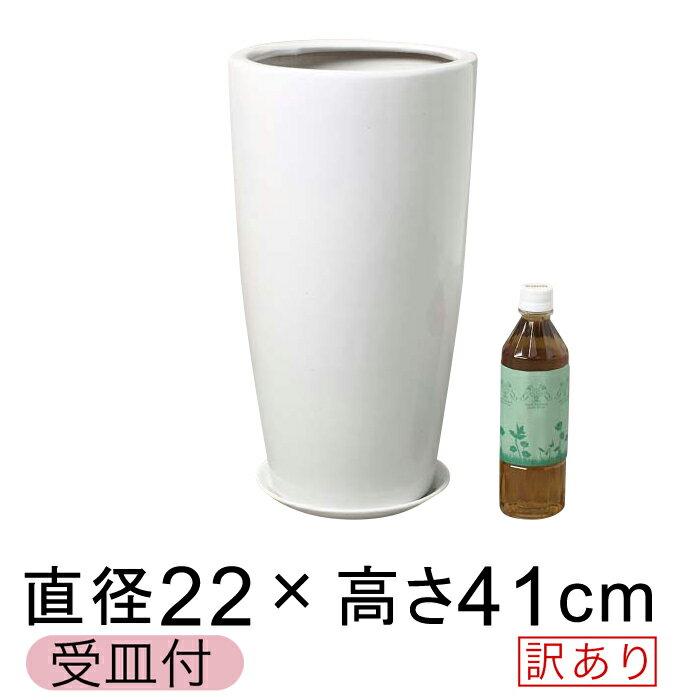 【訳あり】ツルツル丸ロング 深型 陶器鉢 白 つや有 M 22cm H41cm 12リットル 受皿付◆注:実際の受皿は深めの直径約19cmです(3枚目の写真参考)◆[of20]