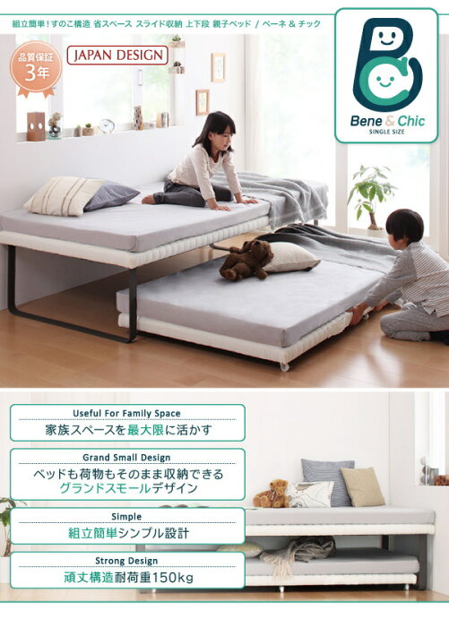 ベッドも荷物もそのまま収納できるグランドスモールデザイン!組立簡単シンプル設計!頑丈構造耐荷重150kg! 商品名 親子ベッド Bene&Chic ベーネ&チック 薄型・抗菌国産ポケットコイルマットレス付き 上下段セット シングル 配送について こちらの商品はメーカーより直送いたします。