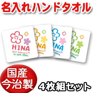 出産祝い 誕生日 プレゼント 名入れ 名入れ無料 【国産今治製タオル】 25x25cm ハンドタオル 4枚セット・名前入り 手描き風デザイン フラワー 女の子 誕生日プレゼント 百日祝い お七夜 送料無料 ココロコ