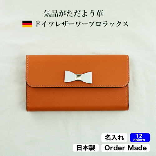 オーダーメイド 長財布 かぶせ 三つ折り リボン ワープロラックス リモンタナイロン 本革 レザー 名入れ レディース ドイツレザー オレンジ ホワイト 日本製 国産 ロングウォレット ギフト 贈り物 プレゼント 誕生日 シーバイシーレザー 送料無料